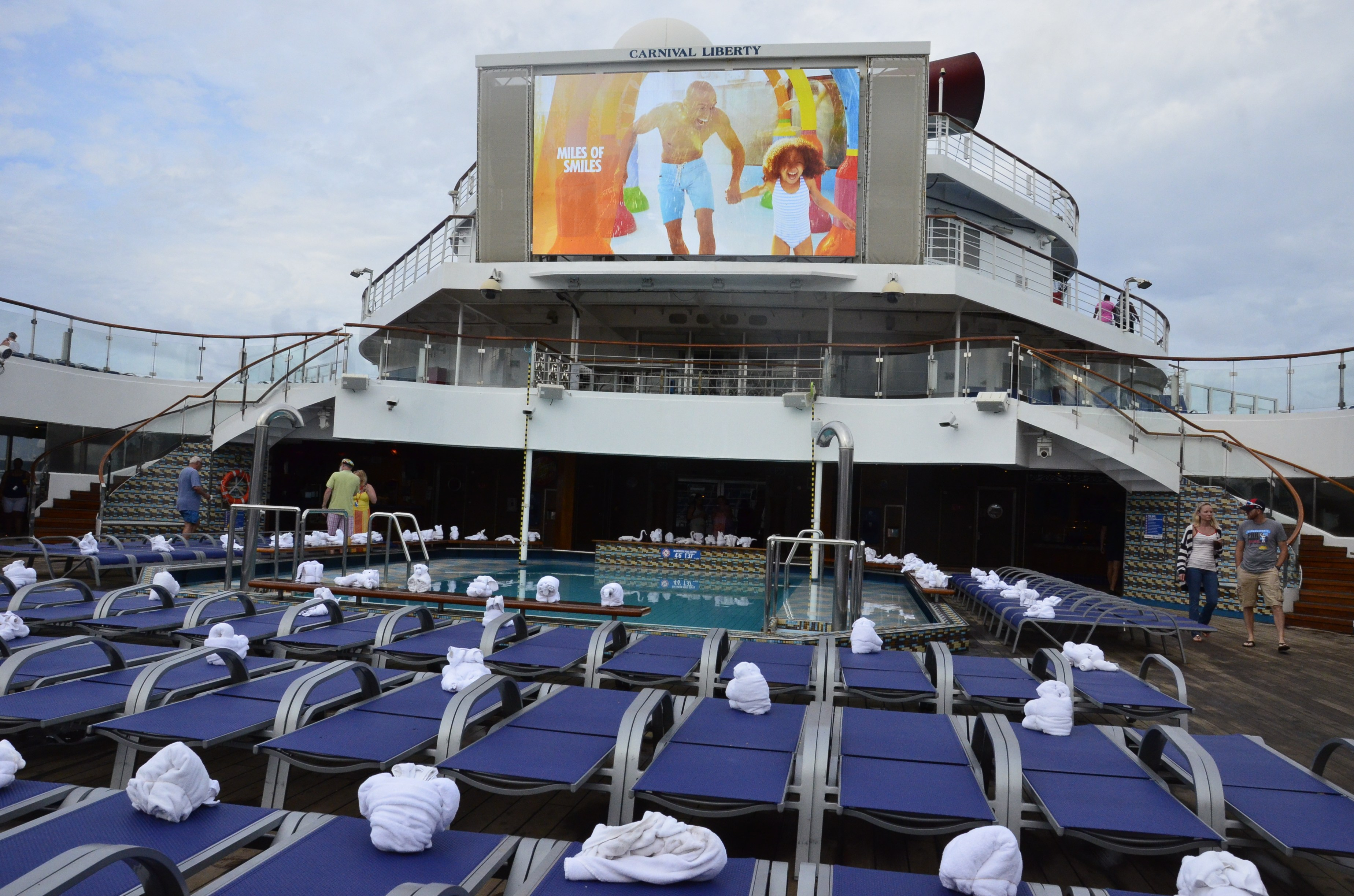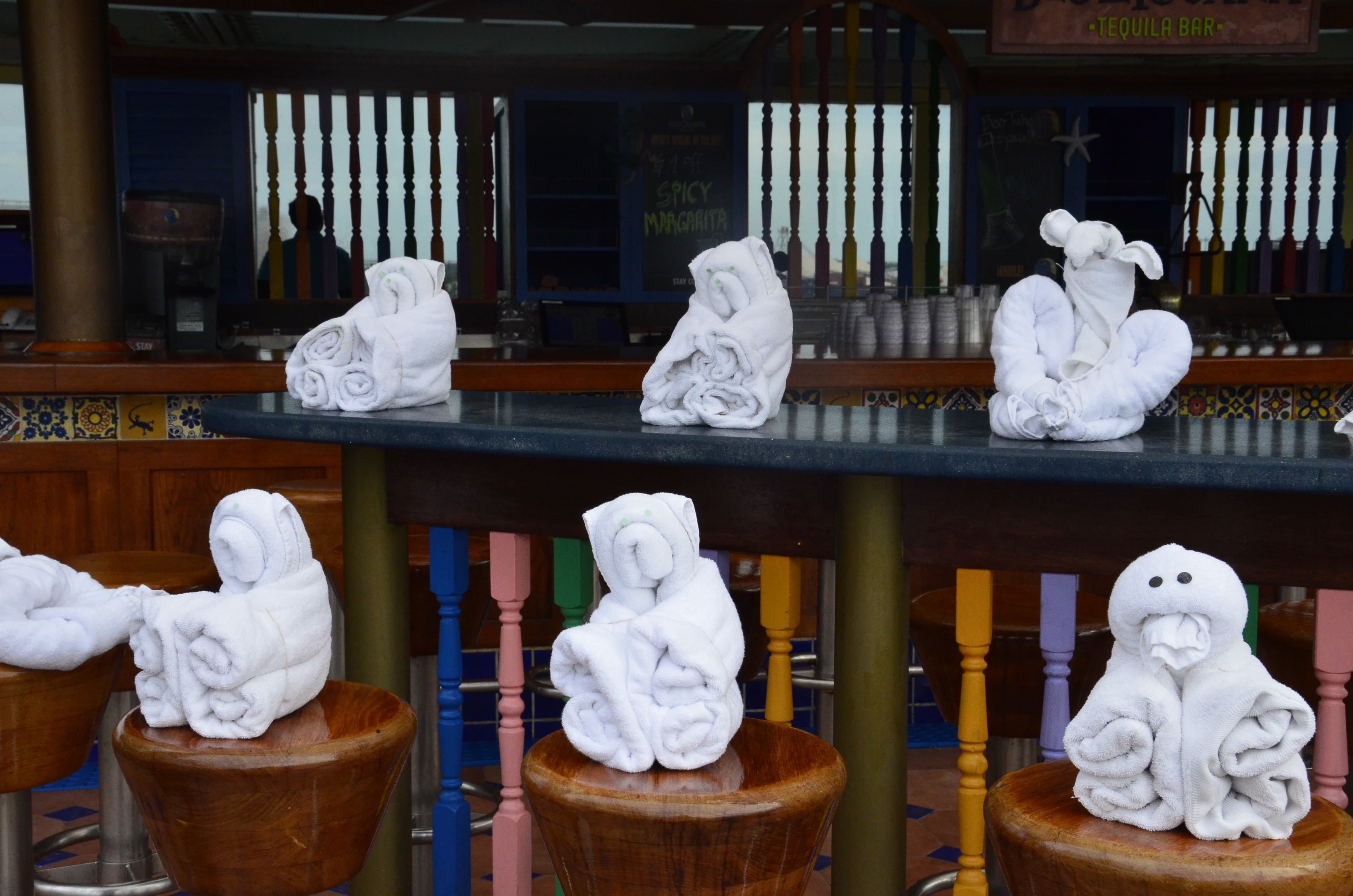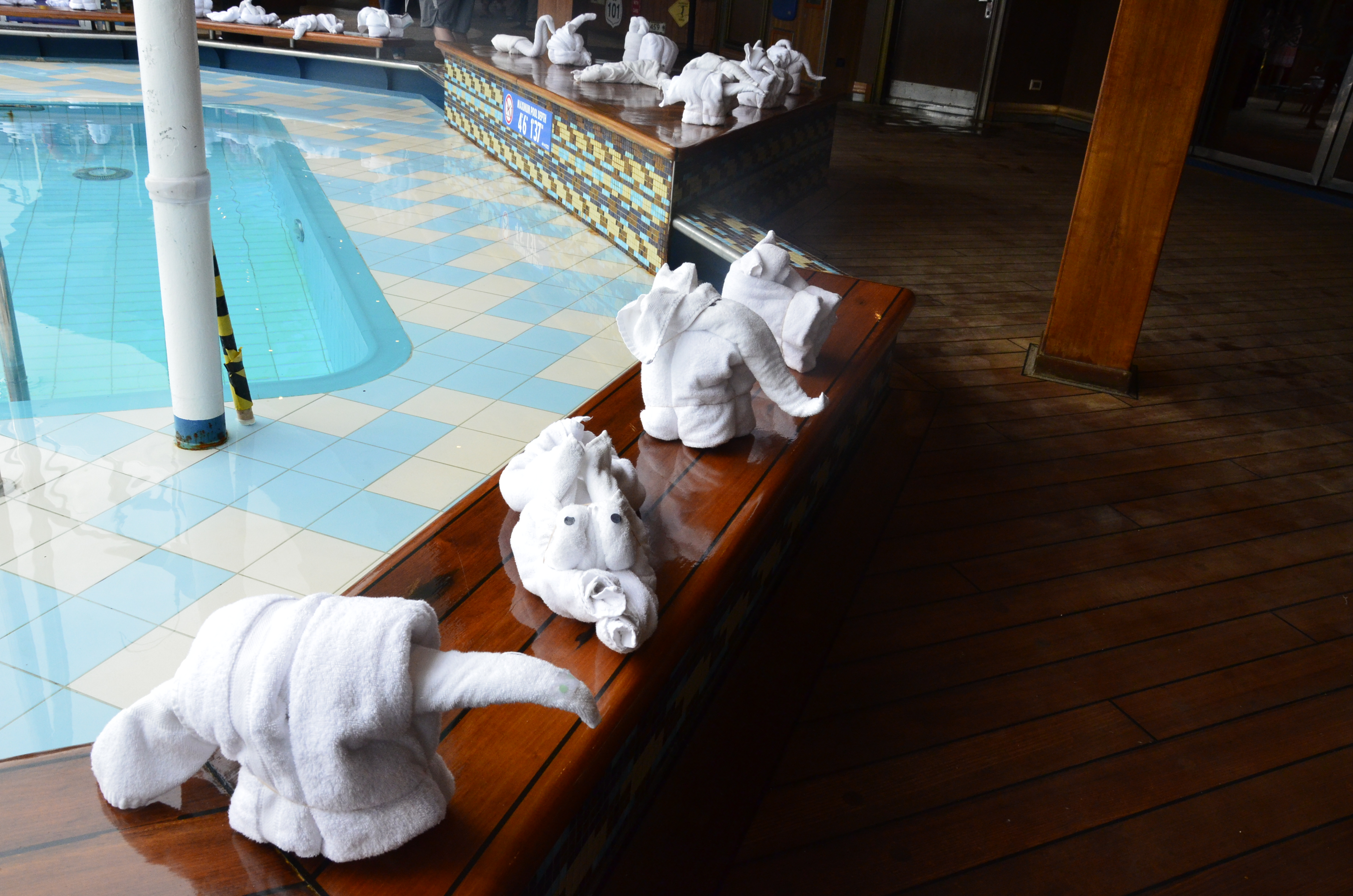 After leisurely “bobbing” on serene Atlantic for 3 days and 4 nights on cruise Carnival, occasionally heading off to islands of Nassau and Freeport, it was time to disembark. Early morning on the last day brought not so surprising drizzle which was very much welcome anticipating hot and humid Orlando weather, and surprise in form of origami out of beach towel on Carnival deck while going for breakfast. Whole top deck benches around pool and bars were occupied with curious little “audiences”.
