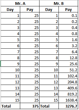 Now hypothetical example: During quarantine situation, Mr A was in badly need of smoking. He had been careful enough to procure enough stock of his favorite brand of smokes that can last for month or two but forgot all about matchsticks. Mr. A knew that neighbor Mr. B had ample stock of matchboxes. He asked to pass on single matchstick to Mr. B. Given the exploitative circumstances, Mr. B asked 0.25$ for single matchstick. Mr. A infuriated but complied. While paying for single matchstick Mr. A came up with proposal that Mr. A shall give 0.25$ everyday to Mr. B as payment of matchstick but Mr. B should give double matchsticks then previous day till month lasts or pay equal amounts to matchsticks. Mr. B had 10$ matchbox having 100 matchstick. And he had many more such matchboxes. He quickly agreed considering simple math that he is getting 0.25$ for 0.1$ matchstick. What he didn’t know was the power of exponential. After 15 days of such arrangement, Mr A was happy smoker and Mr B was out of all his stock. And as per arrangement, paying price of matchstick to Mr. A that was much larger then he anticipated. You can see below table what went wrong in mere 15 days.