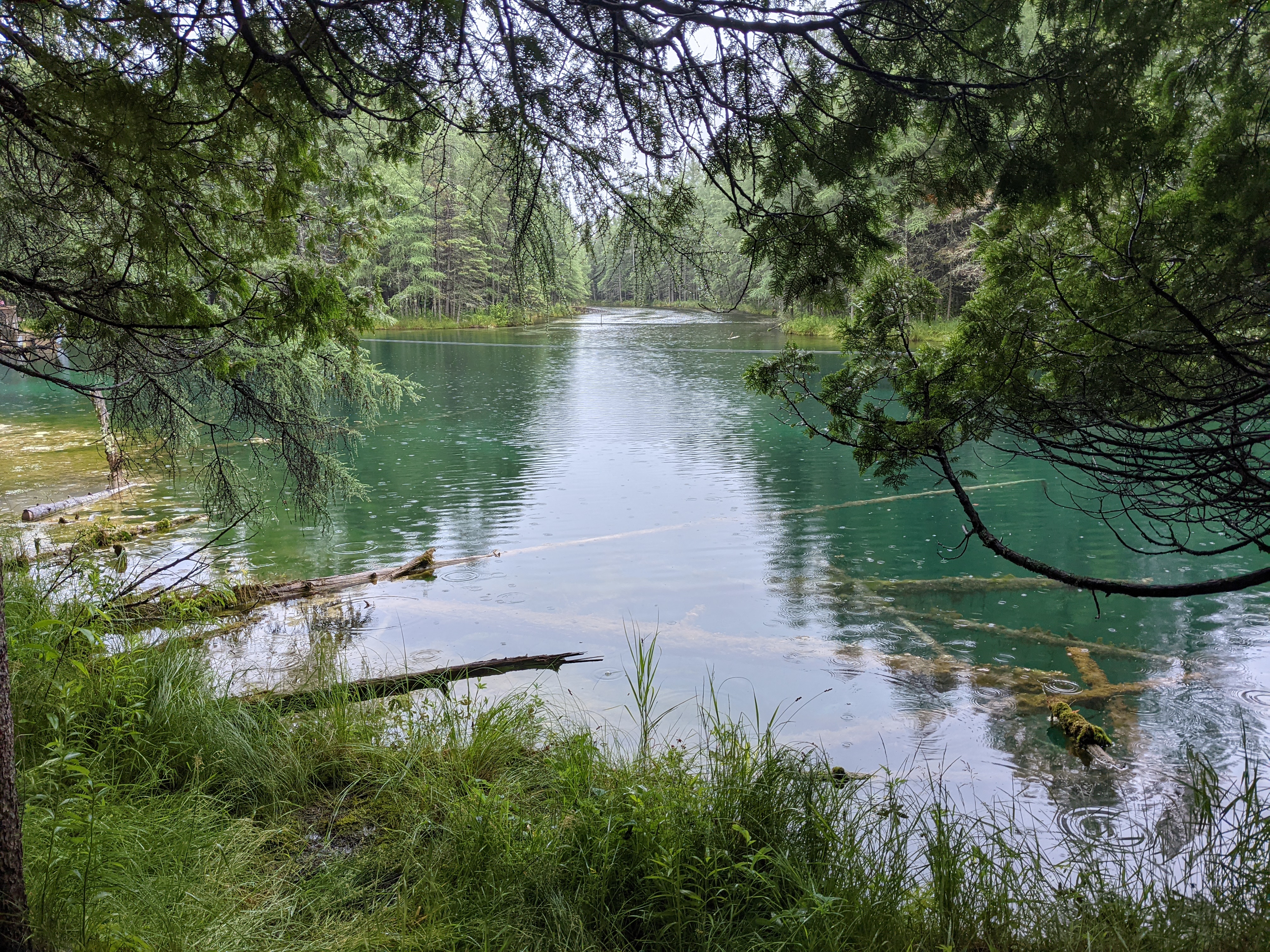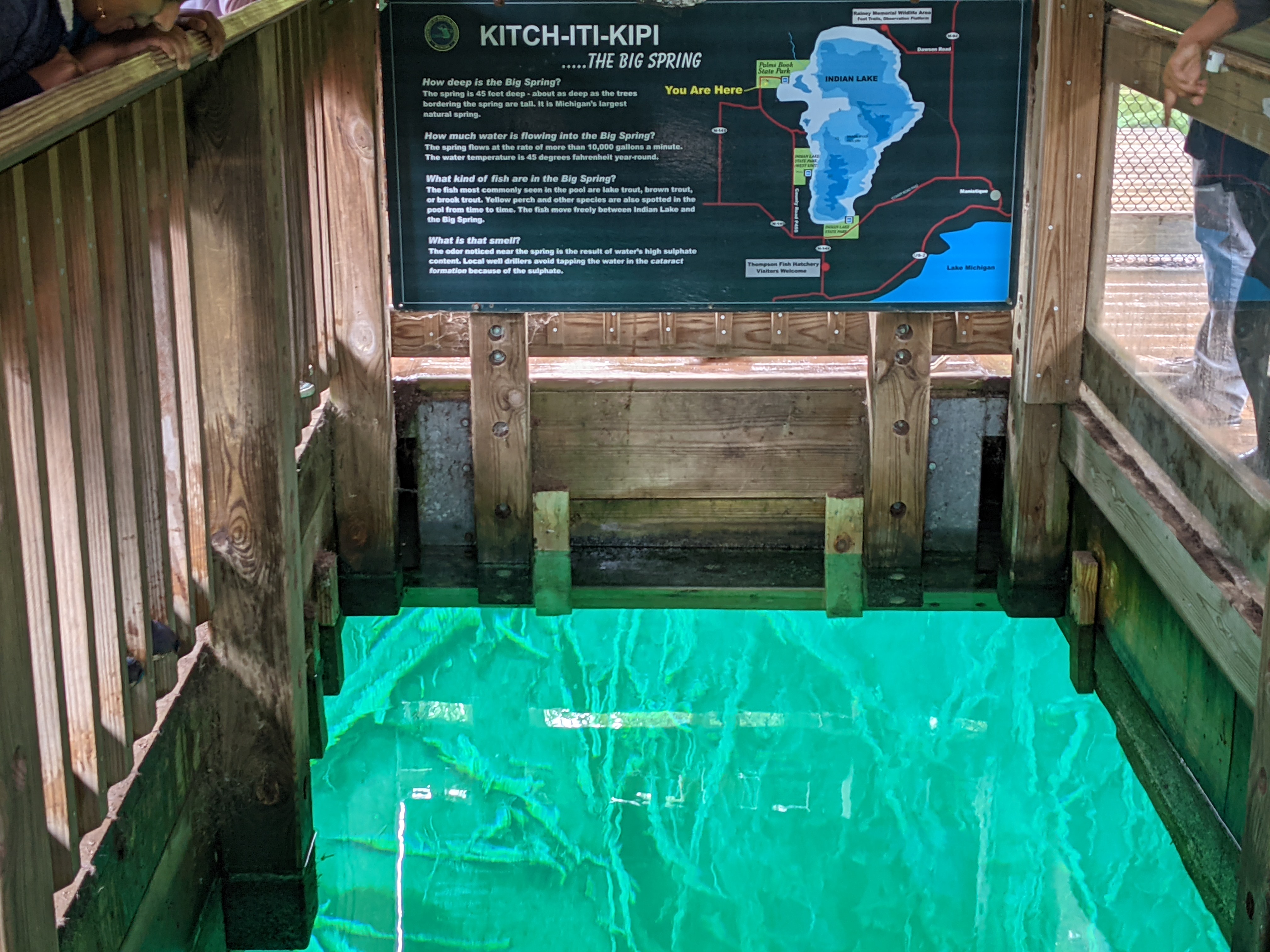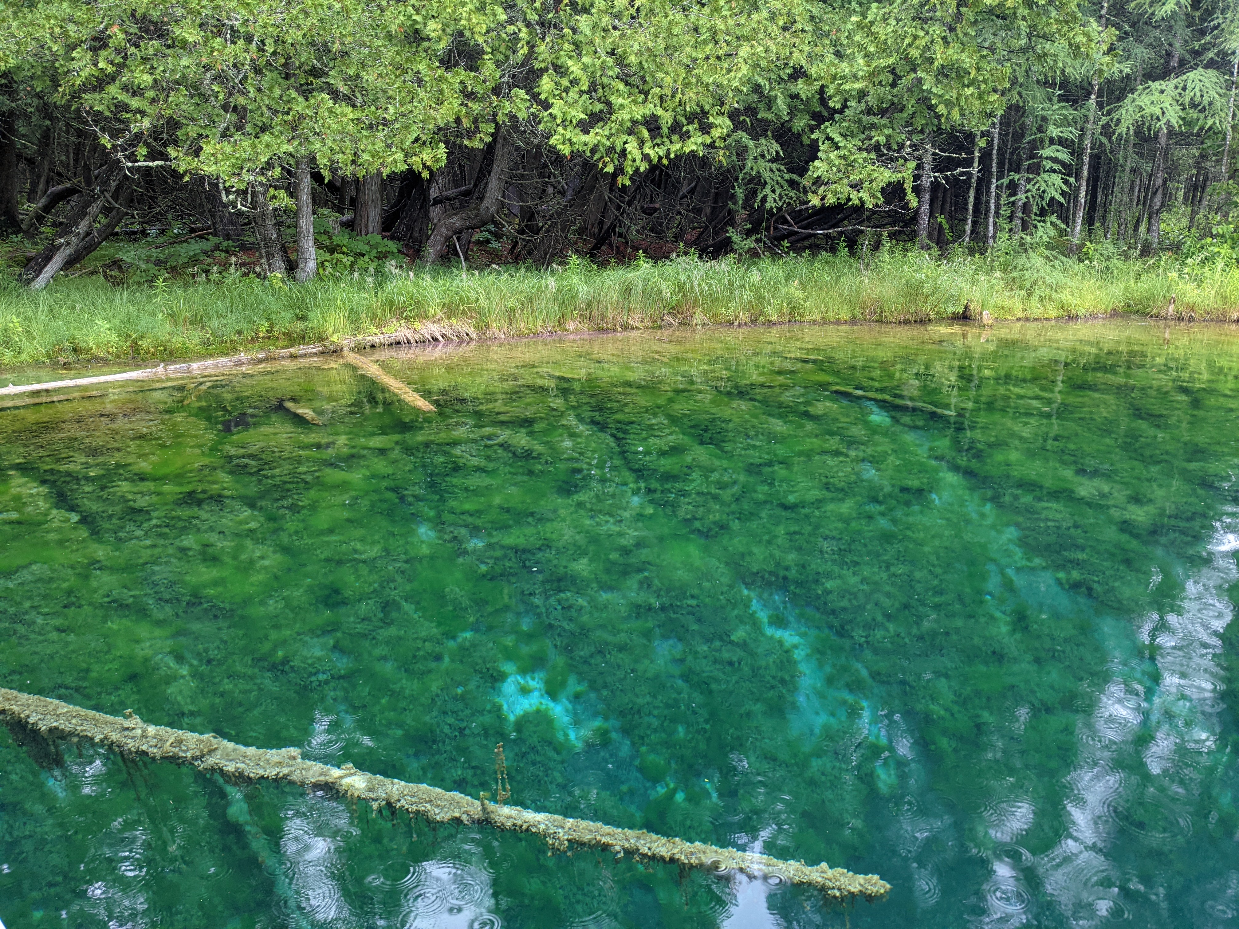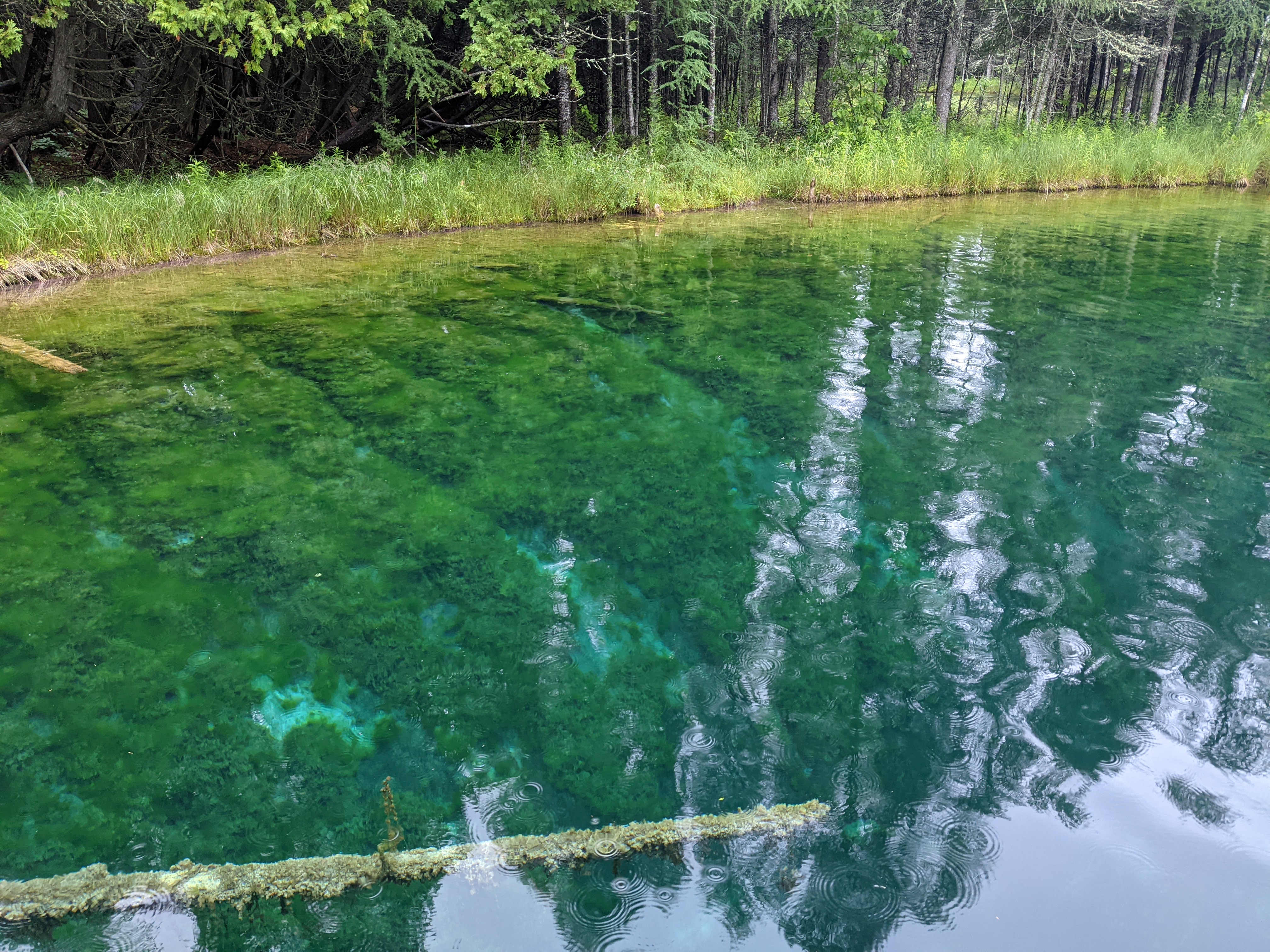 By the time we reached Kitch-iti-kipi, drizzling had picked up and threatened to transform itself into shower. Positively though, it had transformed the green surrounding of the Kitchi-iti-kipi into something surreal. Kitchi-iti-kipi, named after some Indian chieftain lost his life over some foolish quest, is natural spring housing gallons of water cycle through various fissures at its waterbed consisting of limestones. Most enticing part is this “cleaning” process makes the water crystal clear and temperate. A self-operated wooden gondola with open bottom was the way to observe emerald hued clear water and spring’s bottom. As if you were peeking into uniquely different world through some trans-dimensional portal, you could get glimpse of underwater life and water gushing out as muddy jets from fissures in its crystal clear glory. All and all, it was novel and informative experience.