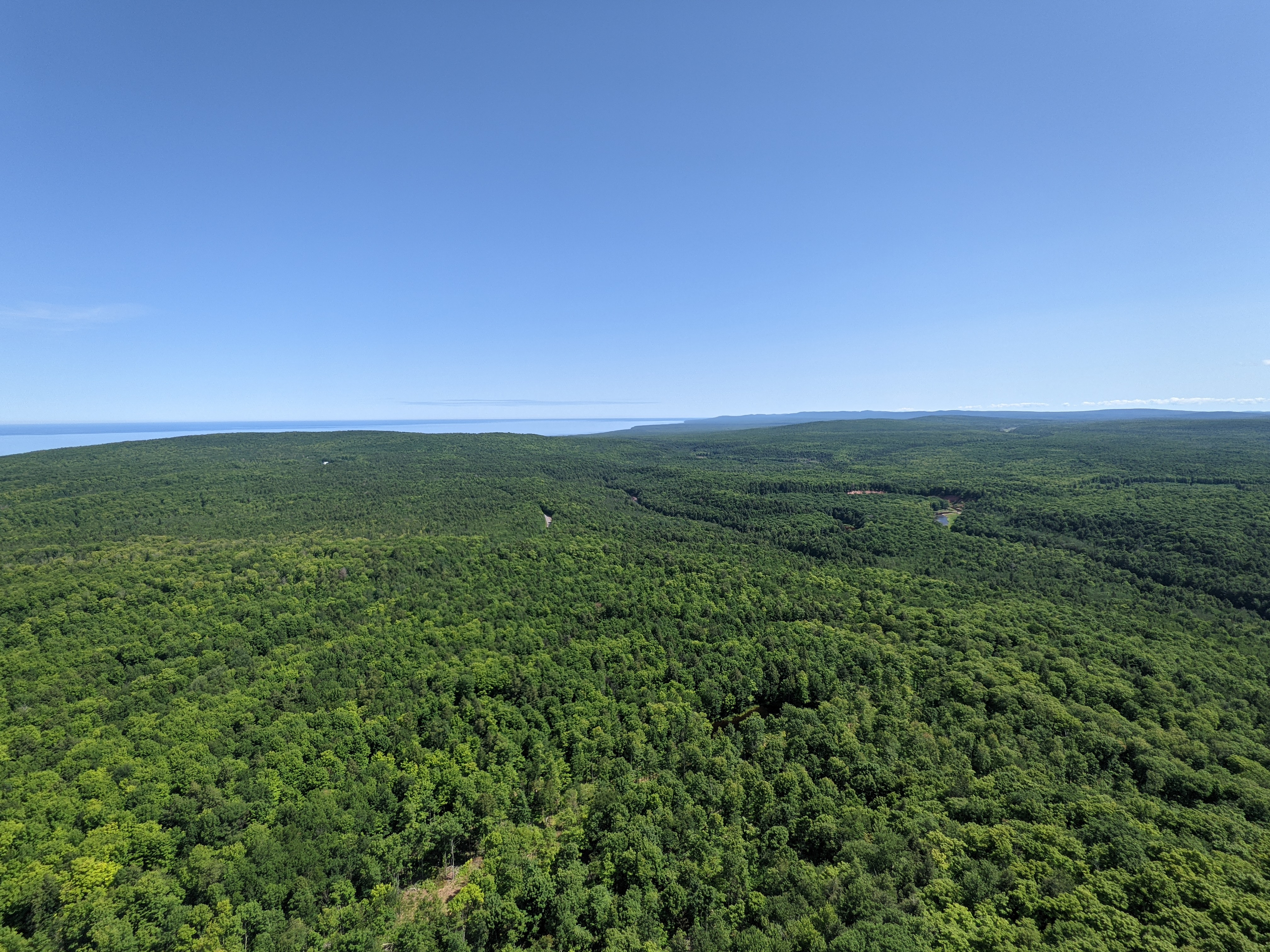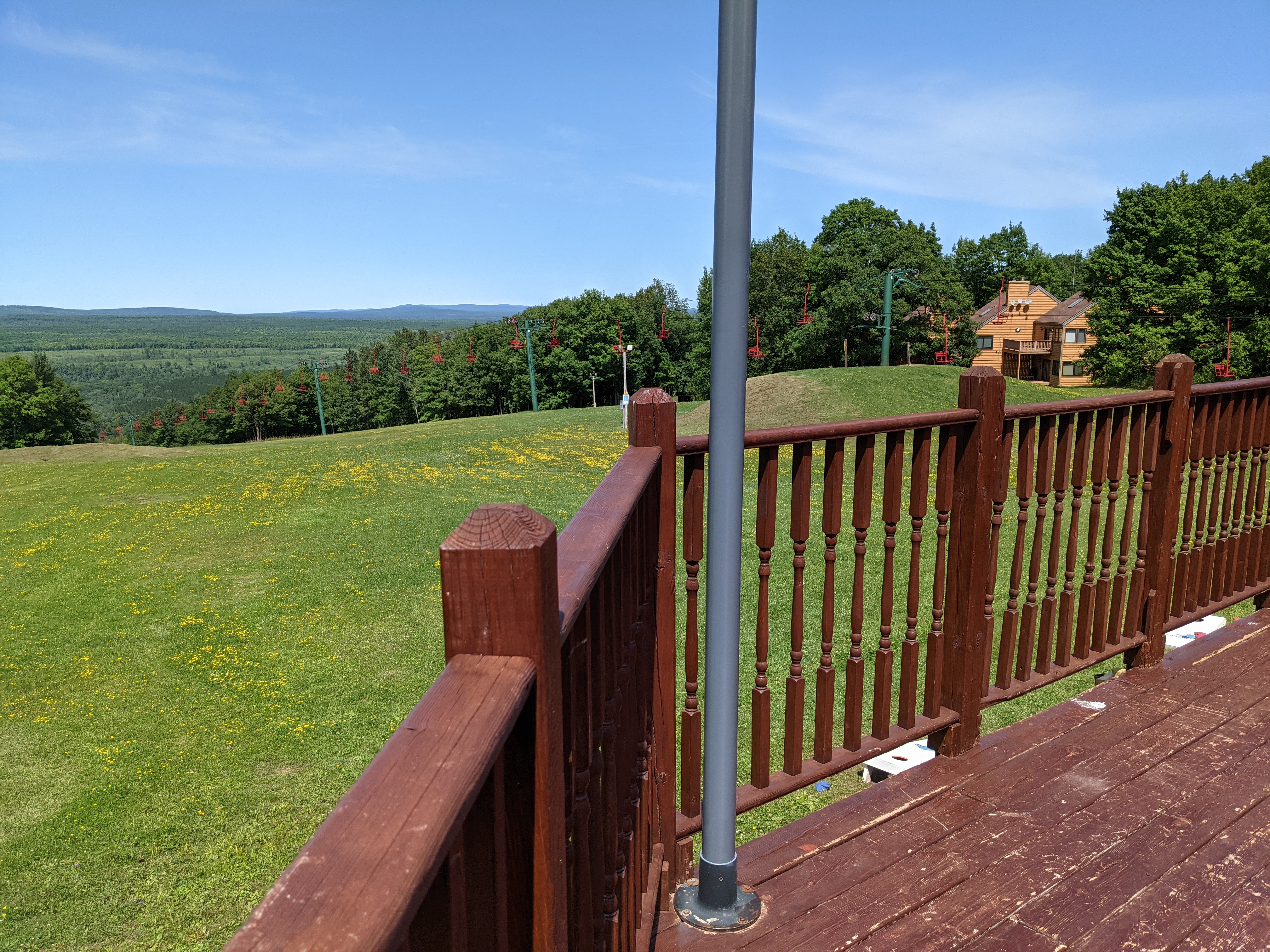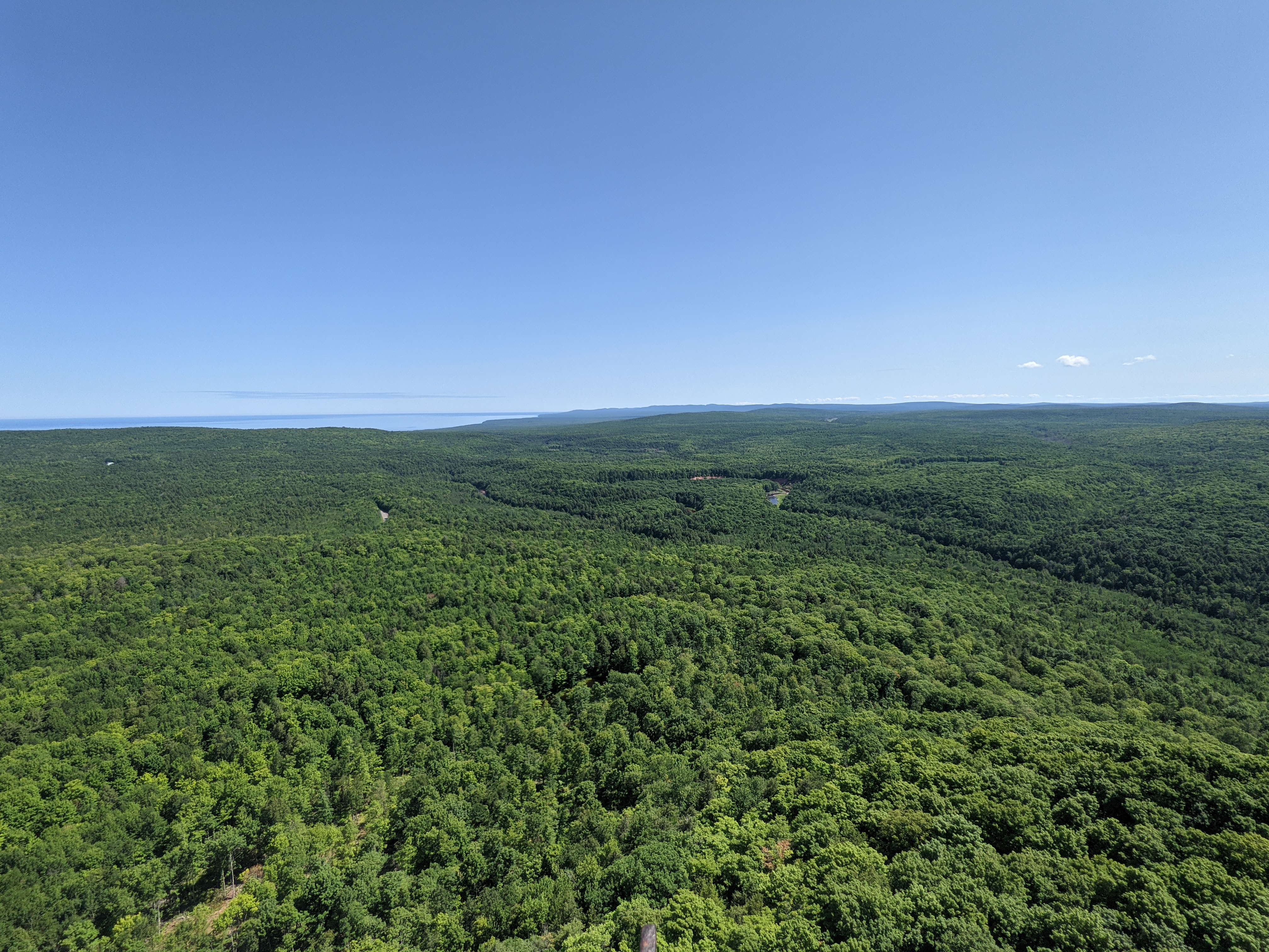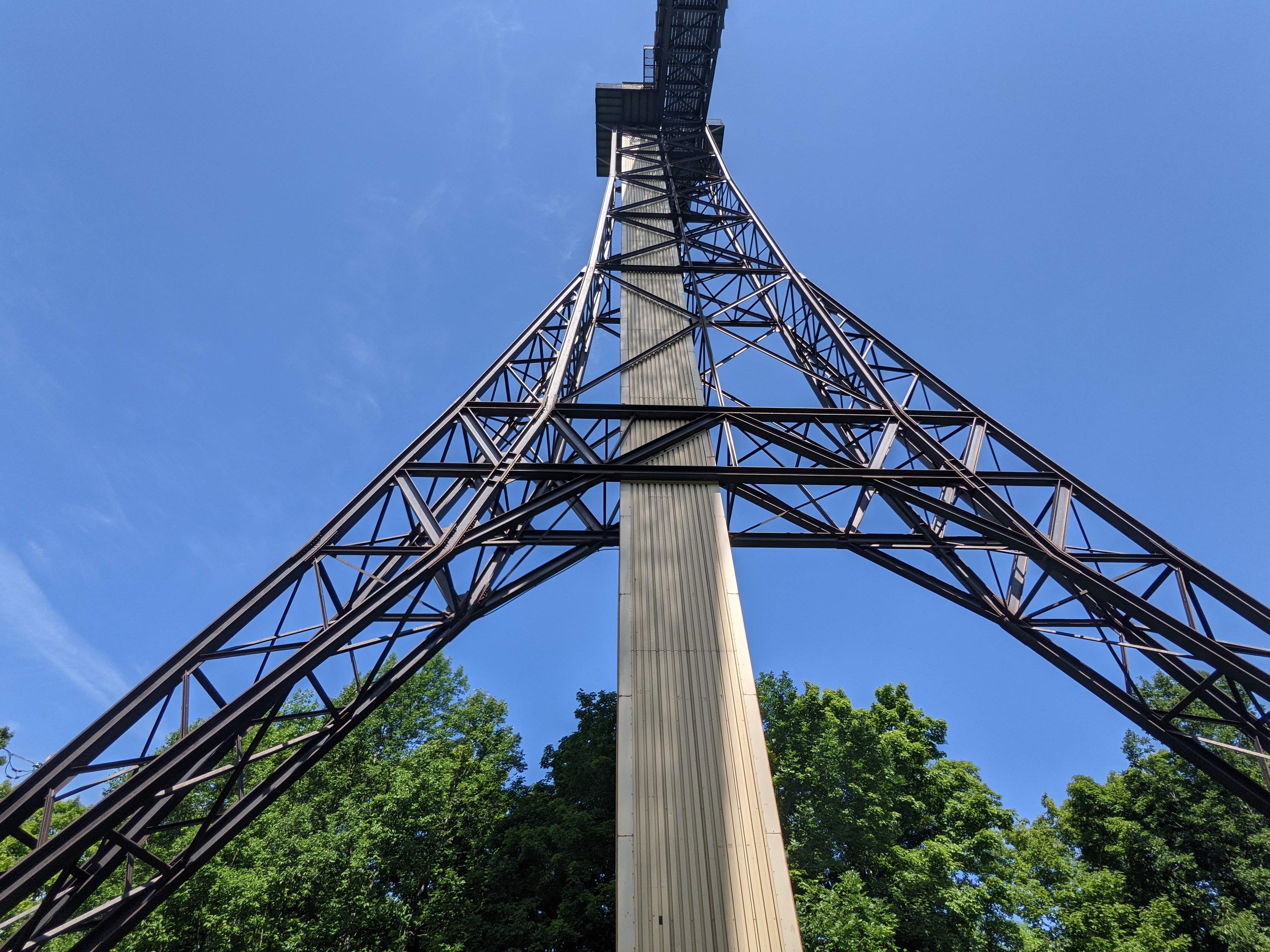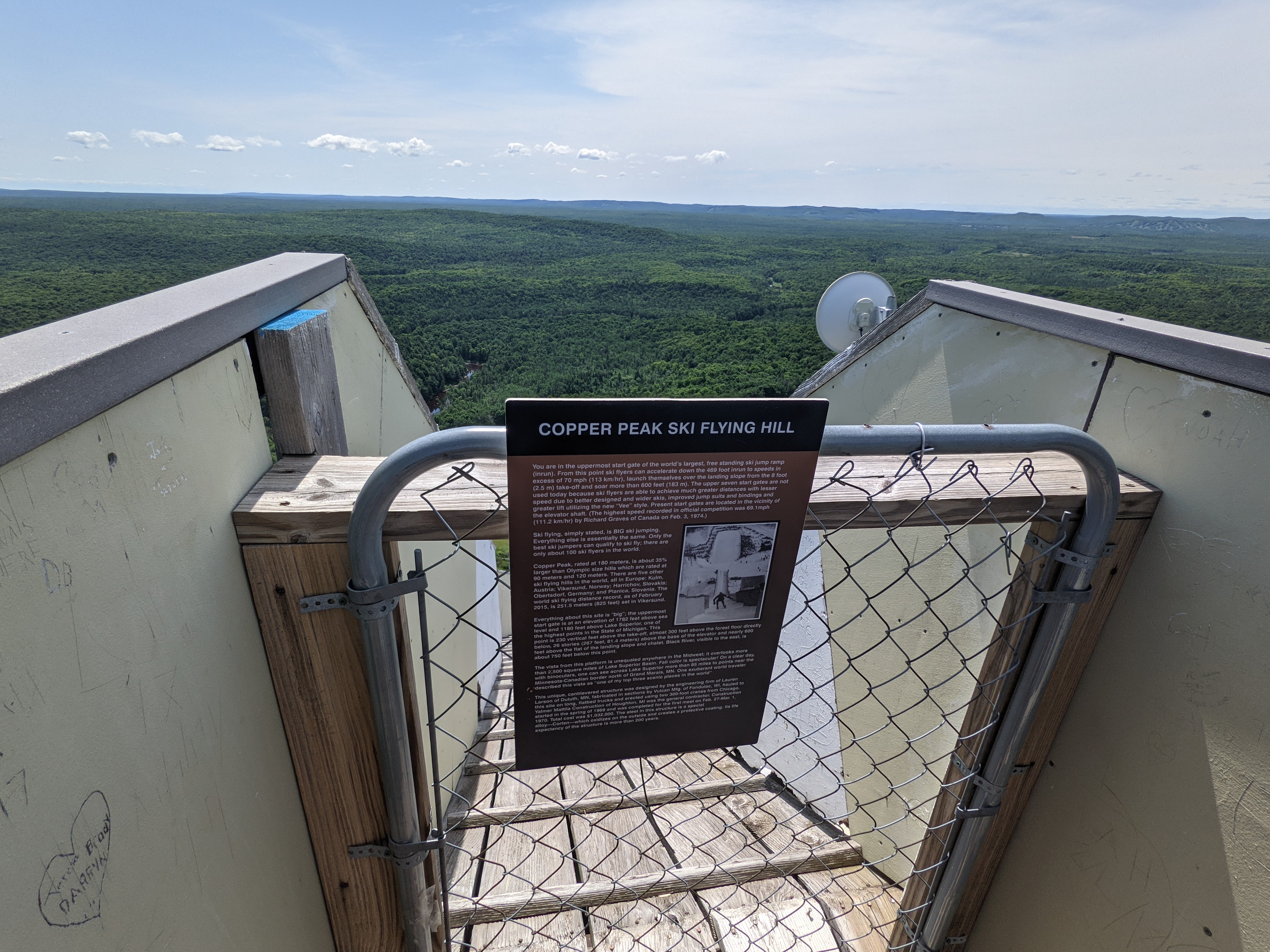 Copper Peak, situated at west end of the Porcupine mountains state park, is basically one of the world’s largest ski-jump ramp. Visitors can take 800-feet chair lift to reach at the base of the ramp or top of the hill from where they had to ride elevator to reach 10-story high observation deck. Unfortunately, chair lift was not working when we visited and had to drive to summit as described before. From observation deck, take safely wire-meshed metal stairs for 8-story more to truly reach at the top start gate. It represents majestic 360 degree vista of surrounding jungle. Summer view was defined with ever stretching canopy of green trees seamlessly fused to blue expanse of sky. You could also observe black veins zigzagging through dense green tops that is black river. Though it would be impossible for us to get the experience of “skiing off” the ramp, we had imitated the experience in lame manner by descending the stairs from all the way from top to crest of the hill.