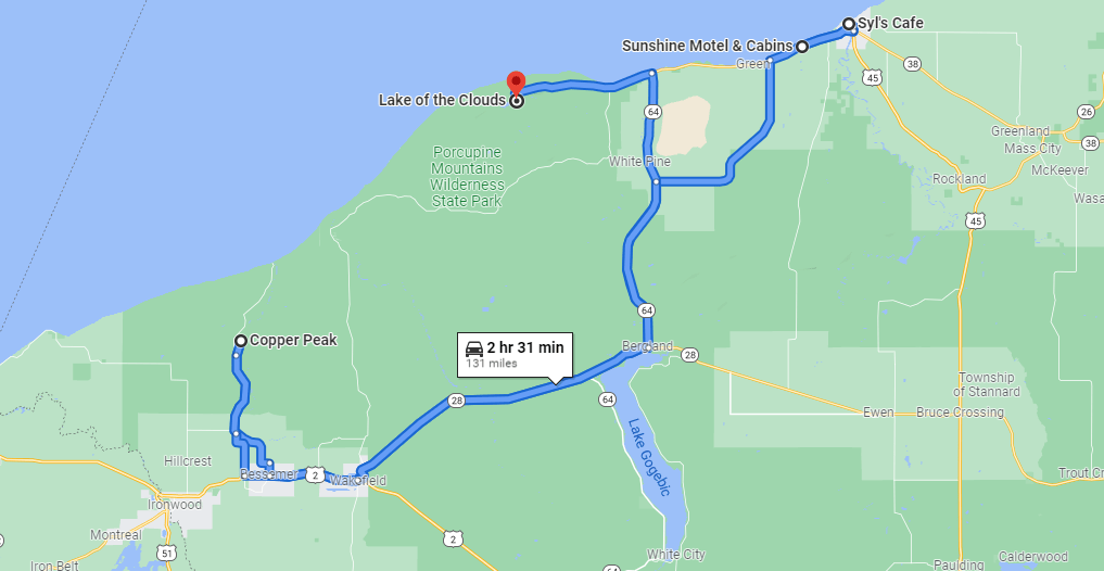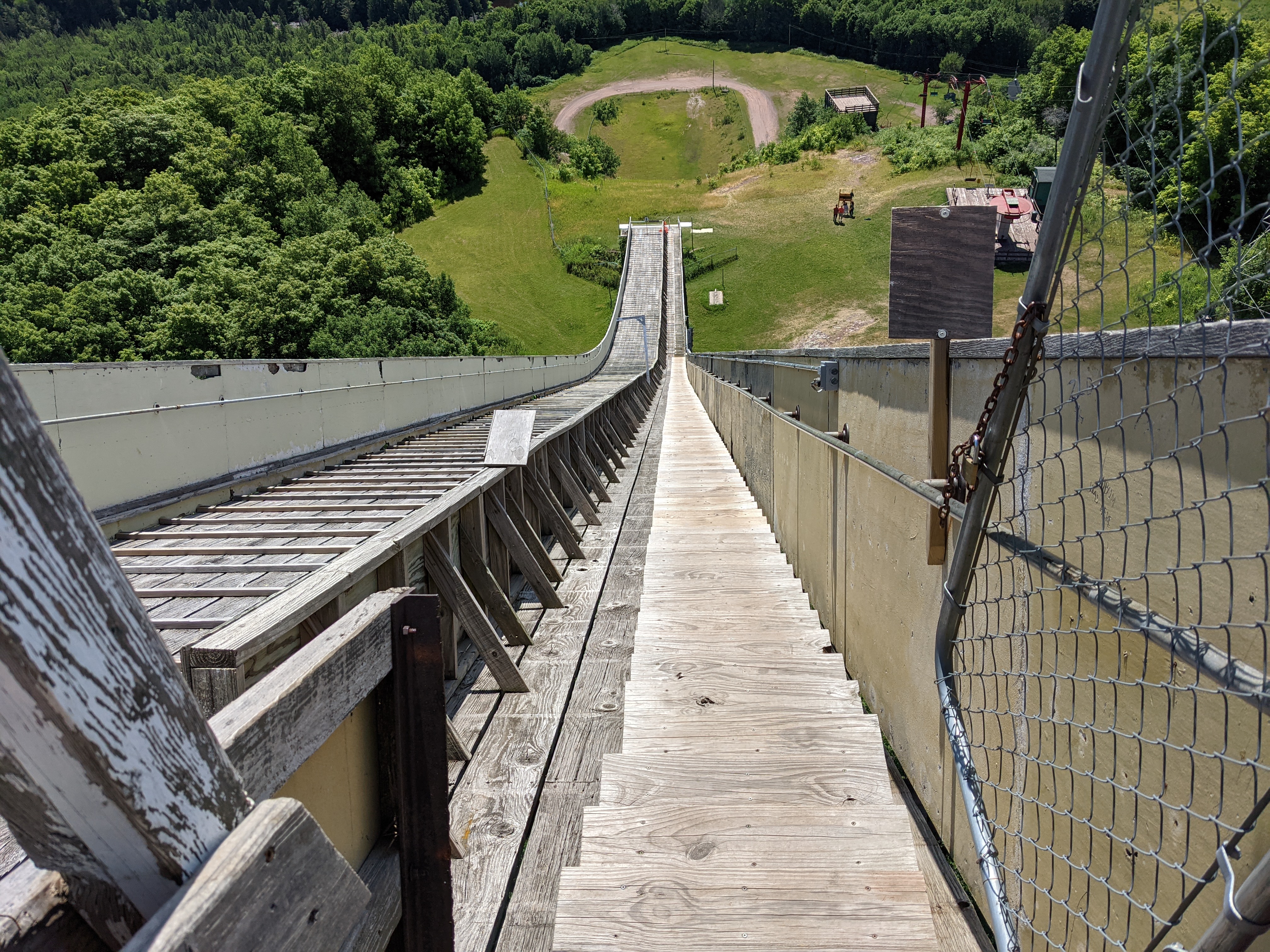 Following the crude map, handed over to us by receptionist, was proven more difficult than expected given the fact that road we required to turn in was not road in itself. Unpaved rugged track, decorated with ditch and potholes, shielded on both side by thicket and brambles and width to pass on single vehicle in file on either direction was what we got as a road to our destined location. Riding on such road was digestive enough to what could have been sumptuous breakfast earlier in the morning. We had freshly made French toast and grilled cheese at nice spot in Ontonagon,MI earlier in the day before we left for only ski-flying hill outside Europe; Copper Peak.