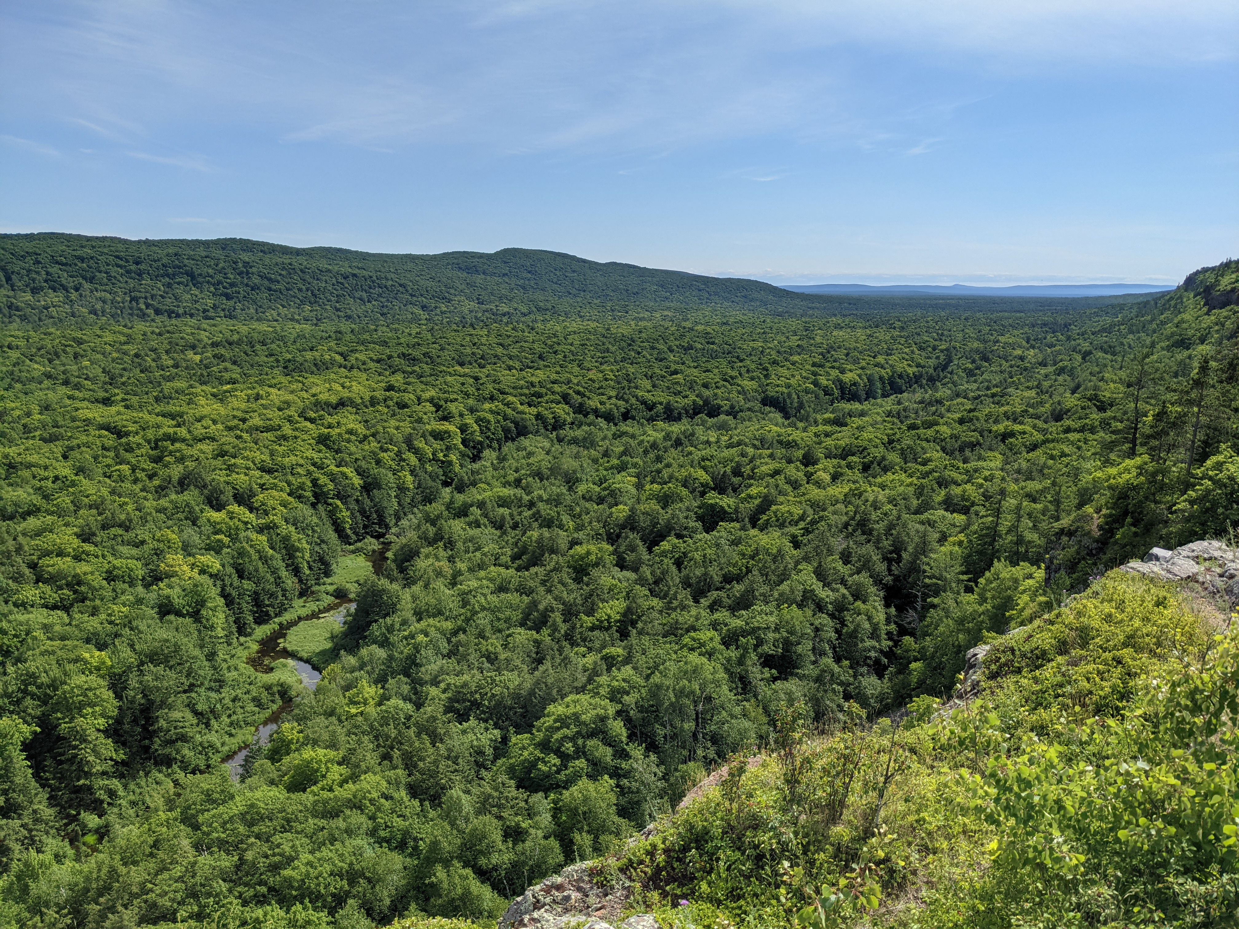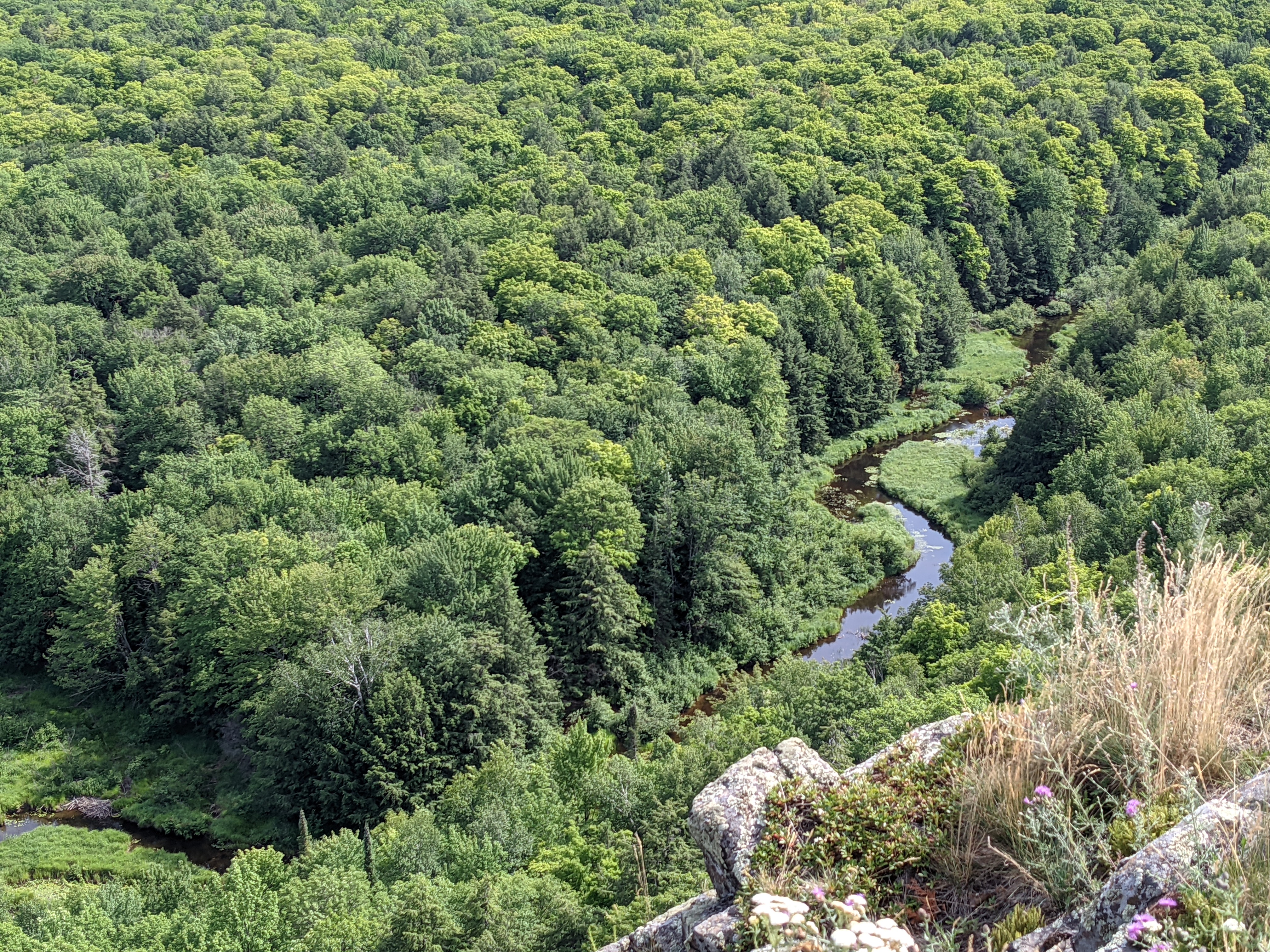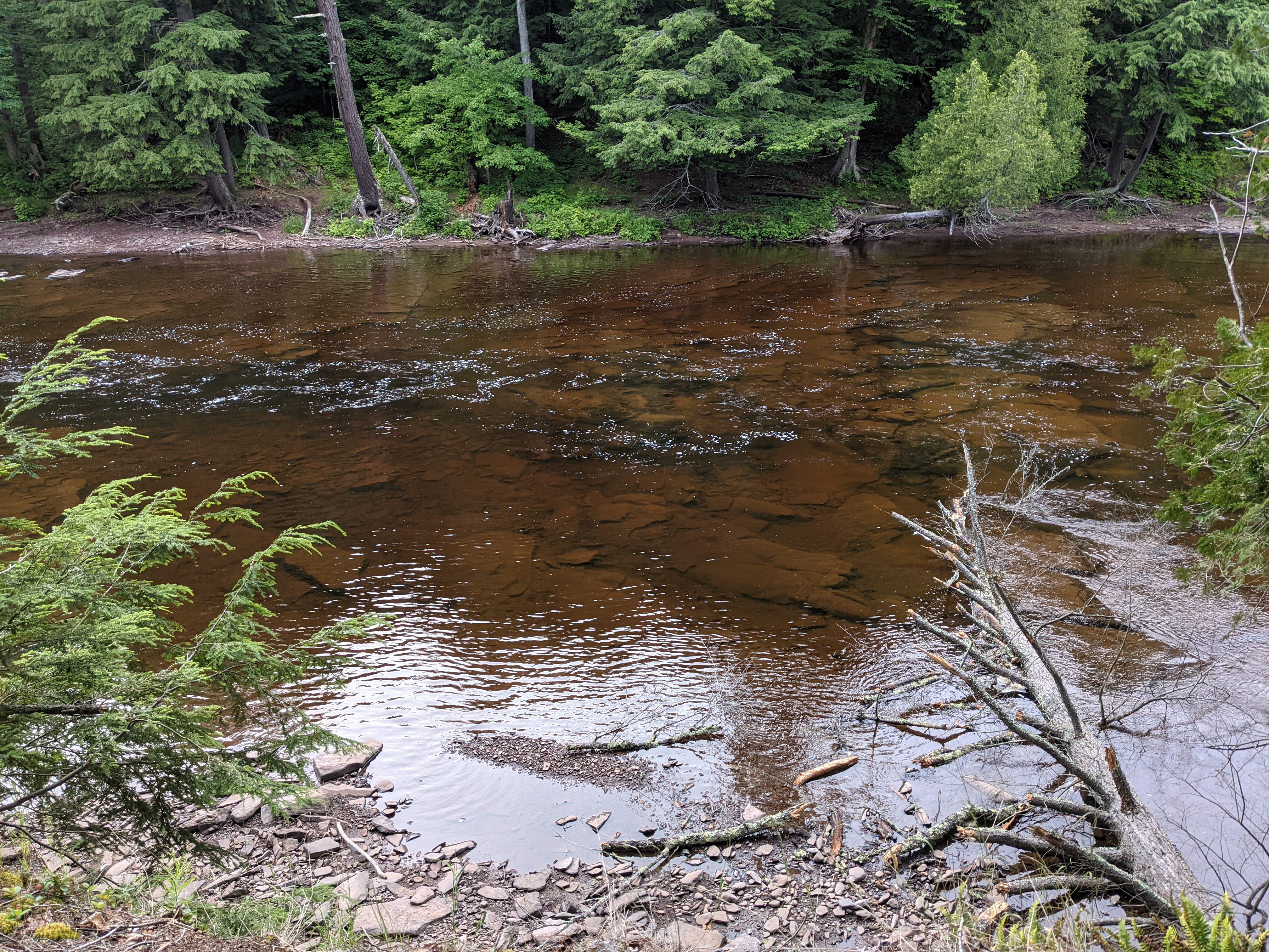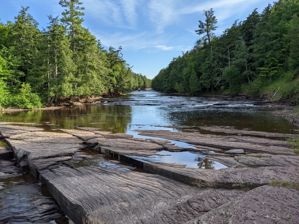 Porcupine mountains state park is known for its stamina-exhausting trails. Given the scarcity of time (and stamina as well required for such full length trails) we opted to complete the hiking trail that circuits the Presque Isle river around 2 miles in total. Trail had been hailed as most beautiful natural trails of all. And it did not prove otherwise. Ancient bedrocks carved in mathematically precise circles and curves by rushing water was inquisitive enough along with soothing foamy water, sometimes falling few feet causing small falls, sometimes serenely splashed down via stepped rocks, was equally engaging enough. At some point, we had to cross the semi-dry bedrock where upon we were presented with brilliant vista of rocks, water, tree lines and sky converging to natural excellence at distance.