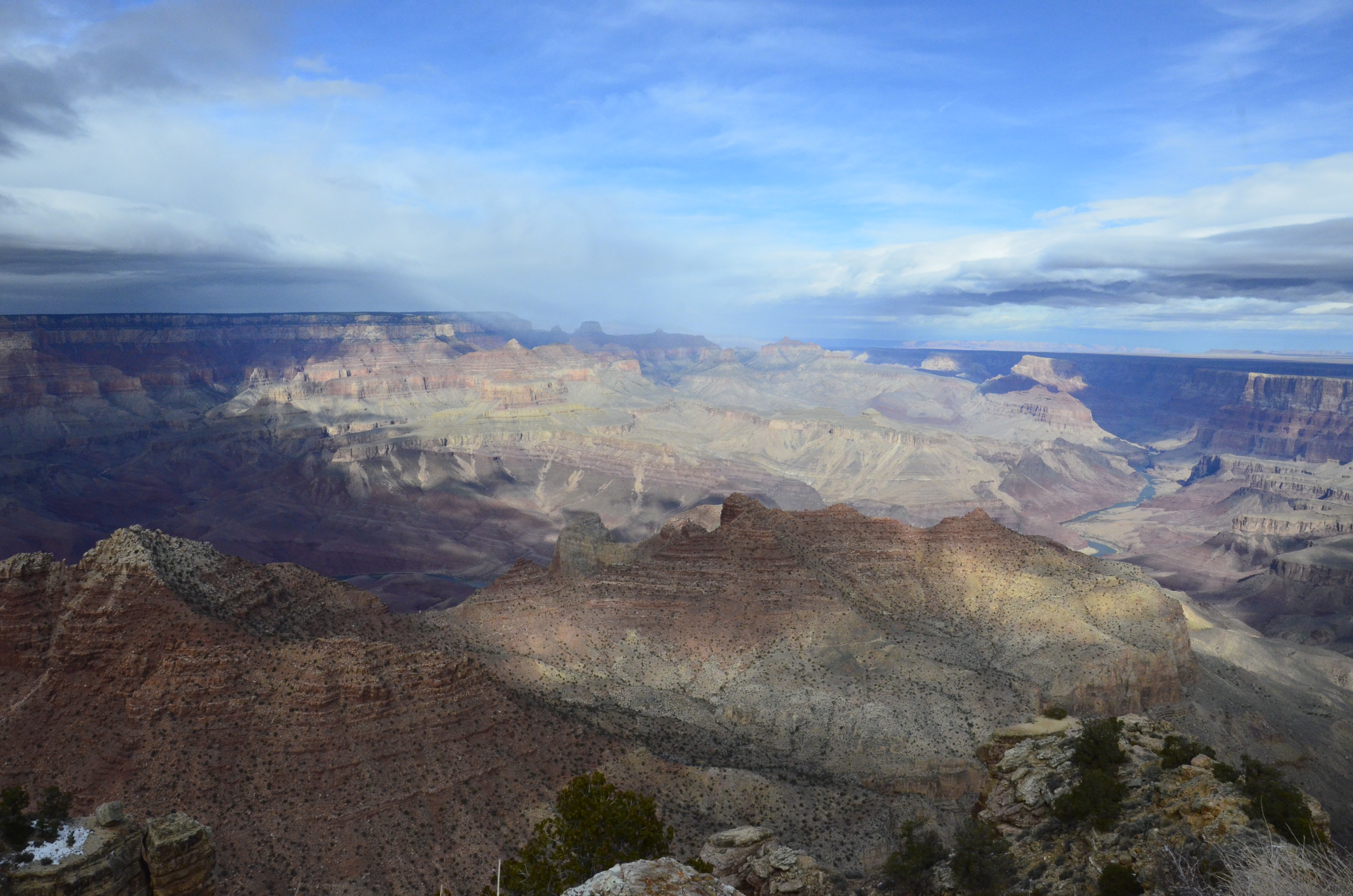 Desert view drive hosts six canyon view points, four picnic areas, some unmarked pullouts and ruin and museum along the way. As soon as we started, it was evident that we were in race with escaping sunlight and approaching dark clouds as if we were running away from dark evil spirit that was hell-bent on devouring our traveling spirit and fun. A very high wind crashing to rock face and lifting upward surging in torrents of cold waves had also started to make everyone shy away from cliffs and edges. At least, it was good move by nature to keep over-enthusiastic selfie lovers out of the harm’s way. It was alluring mixture of faraway sunlight illuminating part of canyon with shimmering colors while part of it, doused in dark grey shadows. Nature’s colorful yin-yang.