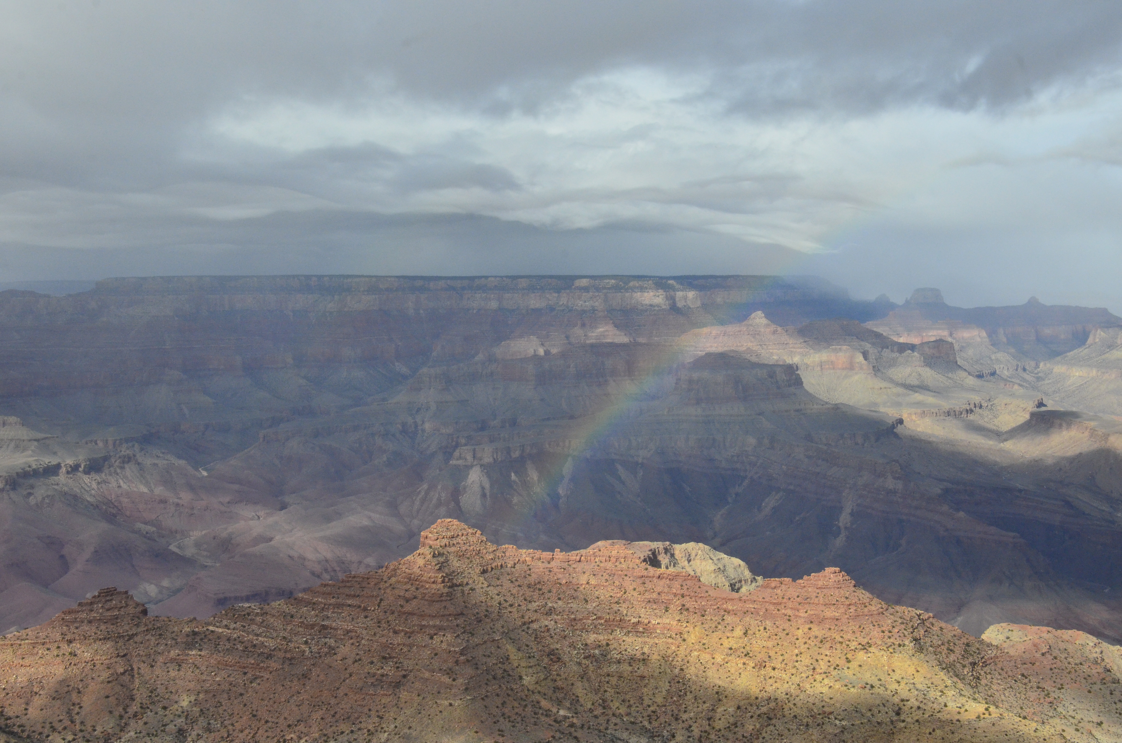 One after the other, we stopped at most of all vista points on the way, getting the feel of the canyon and evading the fast approaching black clouds, towards desert view watchtower. Rustic looking stone-built watchtower was more akin to lone ancient guardian to backdrop of gorgeous spread of canyon. Gleaming white stone of the watchtower was acting as beacon to attract as much spectators as it could in sunlight that was fast receding with aggressive approach of the rainy clouds. Rain was not far away and threatening to chase away whatever sunlight left with slight drizzle, when sun grew some spine and fought back. While two nature’s finest fought hard, outcome of the fight had presented dream like spectacle for all present to witness; spectacular rainbow spanning over two distant edges of canyon in its seven color glory. Eye-catching. Fantabulous. Out of this word and marvelous. Words are short for such spectacle on display. The day that was made memorable by dark, light and water droplets in the air.