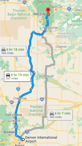 Fly from Indianapolis to Denver -> Drive through Wyoming to South Dakota -> Stay in Hill city, SD